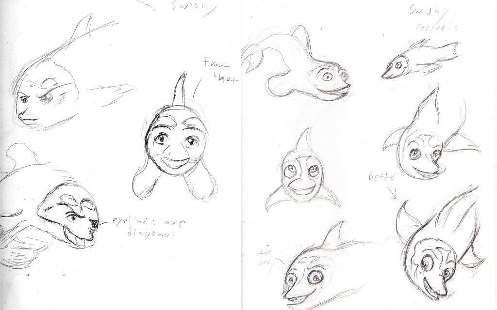 So yes, don’t get creeped out. So this is the concept art of Swishy, Amber’s fish assistant and best pal in the sea. Swishy was initially created for the comic when the idea of Amber having an entire army of fish at her disposal came to be, she needed somebody she could rally commands to and talk personally. Swishy is a Barrel Eyed Fish, which I chose as it was the most obscure fish I could find. In reality Barrel Eyed Fish actually have small tiny eyes that are a great distance away from each other that can be seen on top of their glowing face. This was worked into the initial design, and their were attempts to even give the character eye color, however many of the designs came off as looking rather creepy as you’ll probably see below. I finally decided to just give the character black pupils as opposed to trying to color his eyes. He actually kinda looks like the little dolphin from the anime version of the little mermaid.