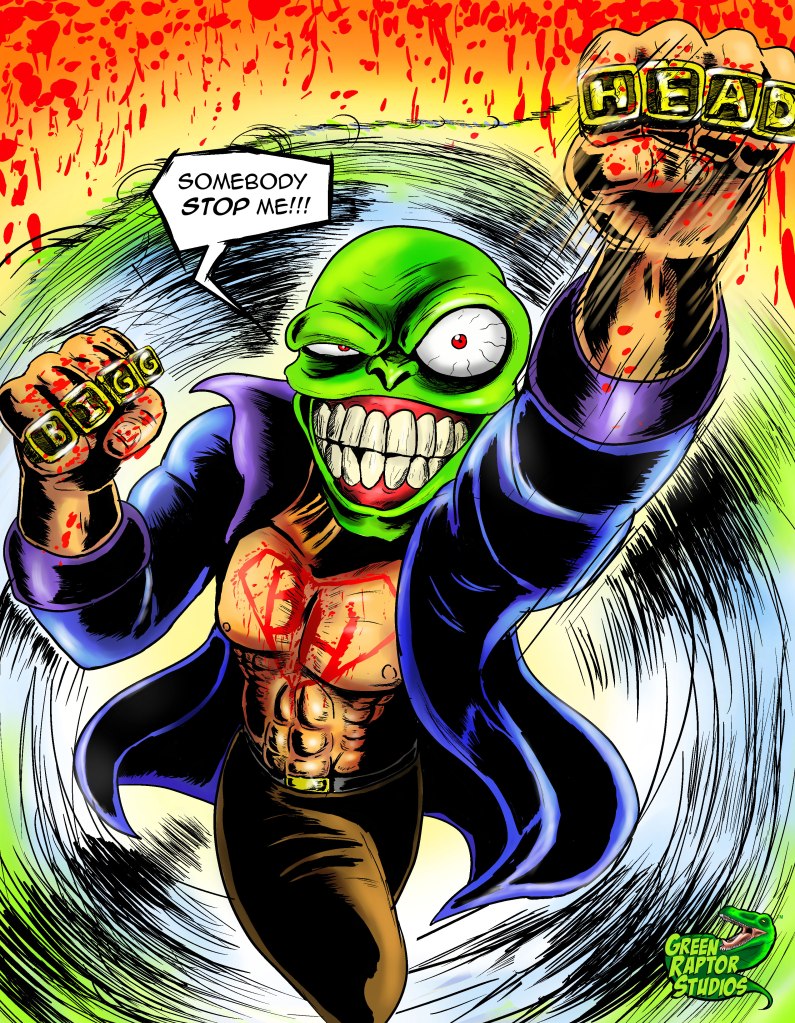 This is a project I’ve had on the back rack for years but only just got around to it recently. Many of you may recognize this character as the Mask, made famous by the Jim Carrey movie from the 90’s. However this particular drawing is inspired by the original comics published by Dark Horse which are a much darker and somewhat more tragic story. The character in those comics was referred to as Big Head, and he didn’t necessarily have only one alter ego, rather the mask itself would fall to numerous people. Mainly it would come to people who were down on their luck and had built up repressed rage at the world around them. The mask would provide them immortality and god like cartoon powers which they would then use to unleash their rage at the world around them. It was a fantastically dark and violent tale about taking a joke too far which is why it’s one of my favorite graphic novels of all time, and I also have the sequels as well.