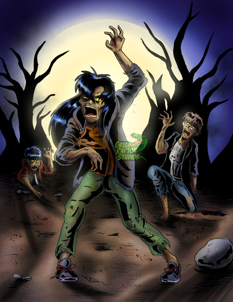 We now come to the Kalwa piece of this years Halloween draw off. Our three protagonists have been zombified. I think it was last year I drew headshots of them as zombies and posted it to the Kalwa website, except they had pupils and were a little more lively. These designs were more inspired by the zombies from Scooby-Doo on Zombie Island, as they looked much scarier. And for this draw off I’m not looking to do anything cute, I want scary all the way.
