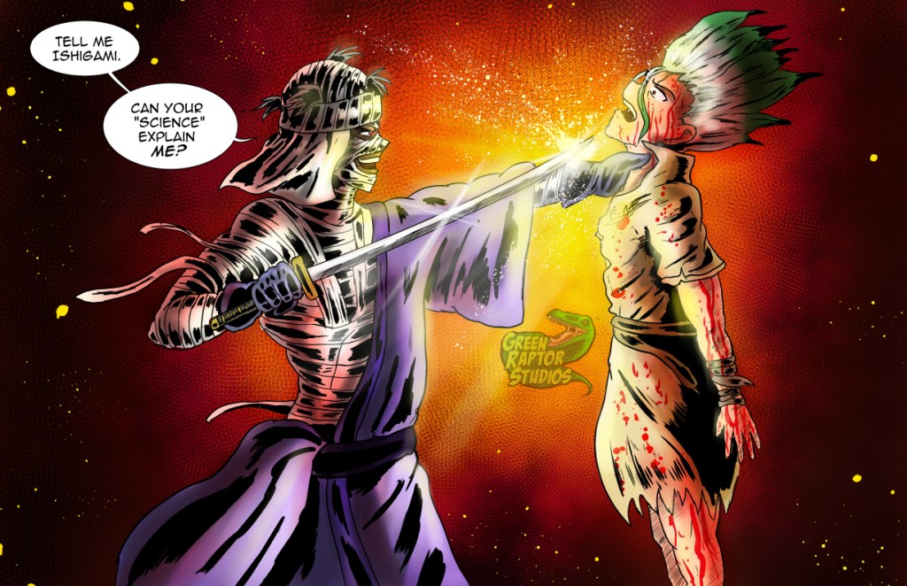 Next is a crossover between Senku and Makoto Shishio from Ruroni Kenshin. This is a crossover pairing that I think is too perfect. Senku, a man whose dedicated his whole life to the idea of science, meets Shishio, a man who defies that very principle. Shishio is a man who was burned head to toe, and yet somehow gained near supernatural powers. This kind of idea would truly leave Senku dumbstruck, forcing him to question everything he knows.